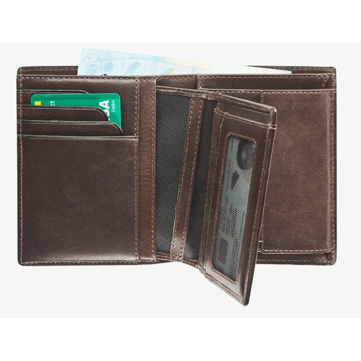 Portefeuille en cuir anti-RFID MAVERICK BROWN avec porte-cartes amovible.Portefeuille anti-vol avec porte-cartes amovible, pouvant également servir de portefeuille week-end. Il peut accueillir 6 cartes de crédit, 2 compartiments pour carte d'identité, une poche pour la monnaie et 2 compartiments pour les billets. La protection RFID agit comme un pare-feu, bloquant l'énergie électromagnétique. Les cartes équipées de puces RFID, telles que les cartes de transport en commun, les cartes de crédit, les cartes d'identité et les passeports, sont ainsi protégées contre la lecture ou la copie illégales. Pas d'inquiétude !MAVERICK BROWN, cuir de vachette pleine fleur tanné végétal. Brun intense, au toucher robuste et huilé. Un grain naturel, avec le caractère que vous recherchez.Cuir de buffle pleine fleurCuir tanné végétalProtection RFIDPorte-cartes amovible6 cartes de crédit2 compartiments pour carte d'identité2 compartiments pour billetsPoche pour la monnaie9,8 x 12 cm