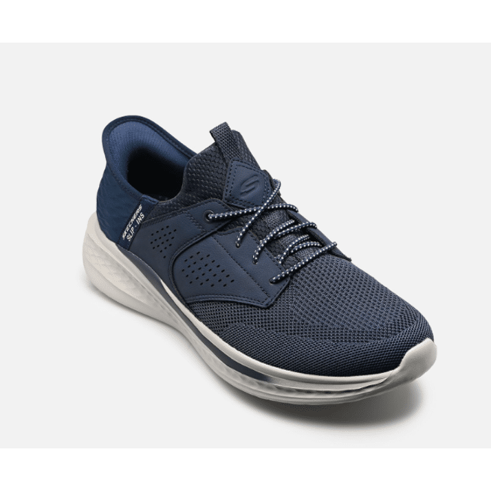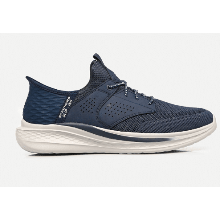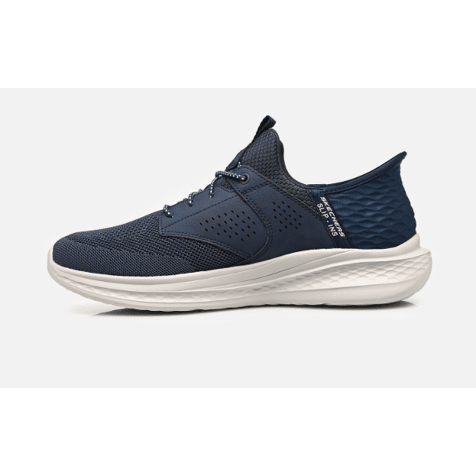 Profitez d'un confort optimal et d'une facilité d'enfilage avec les Skechers Slip-Ins® Relaxed Fit™ : Slade - Caster. Ce modèle à lacets élastiques est doté de notre technologie Heel Pillow™ et présente une tige en mesh et en matière synthétique sur une semelle intérieure Skechers Air-Cooled Memory Foam™ contenant du charbon de bois et un soutien Skechers Goga Mat Arch™.
