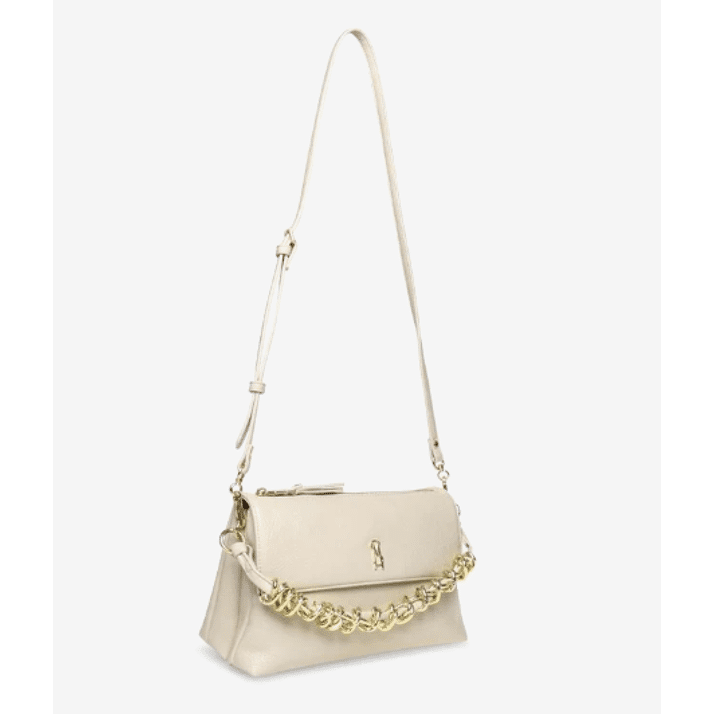 Kleur: BeigeMateriaal: SynthetischAfmetingen: 27 cm lang x 14 cm breed x 16,5 cm hoogVaste handgreepBinnen- en buitenafsluitingen