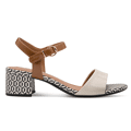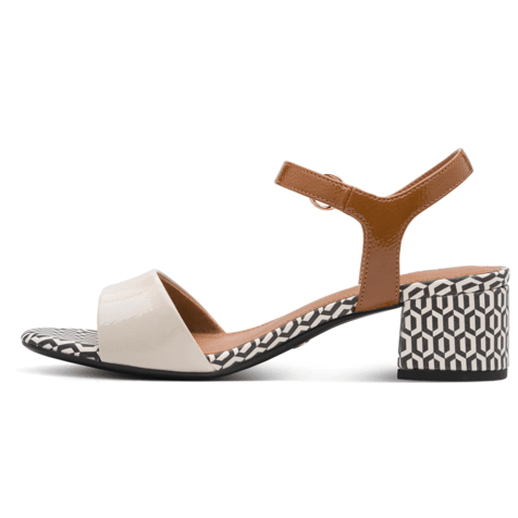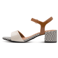 Deze Tamaris damessandaal uit de Koli collectie valt op door de speelse combinatie van ivoor en bruin, afgewerkt met een opvallende geometrische print op de hak en binnenzool. Het design is stijlvol én luchtig, ideaal om je zomerse outfit een frisse toets te geven. De goudkleurige gesp en brede voorste band zorgen voor een verfijnde uitstraling.
